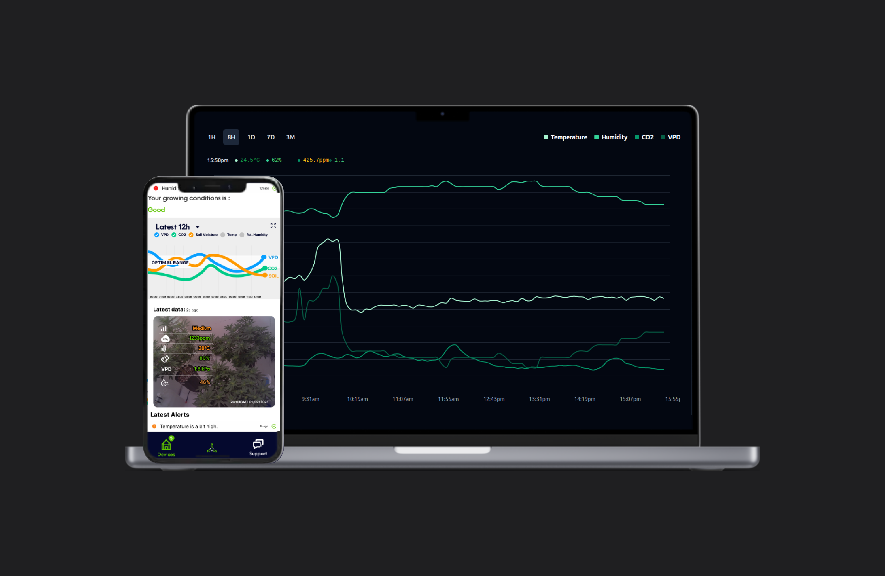 Uma câmera que permite a identificação de luminosidade no ambiente de cultivo e captura imagens que lhe permitem monitorar a vitalidade das plantas, identificar riscos antes que se tornem problemas alem de gerar timelapses semanais do cultivo.